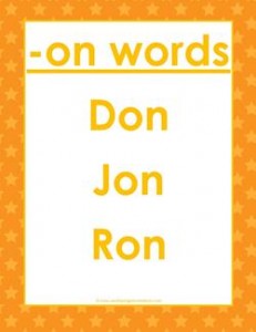 A light orange cvc words list of -on words with all the words in the -on word family: Don, Jon, and Ron. Can you come up with some silly names with the -on ending? Bet you can’t!