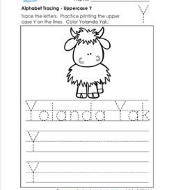 Now here’s an alphabet tracing page with the furriest creature you’ve ever seen, Yolanda Yak. Trace her name, write some good Y’s, and color her in!