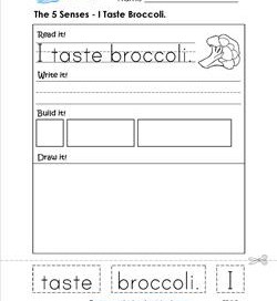 What is one vegetable kids just love, love, love the taste of? You got it – broccoli! (Yes, that was a joke.) Anyway, kids can read, write, build and draw the sentence “I taste broccoli.”.