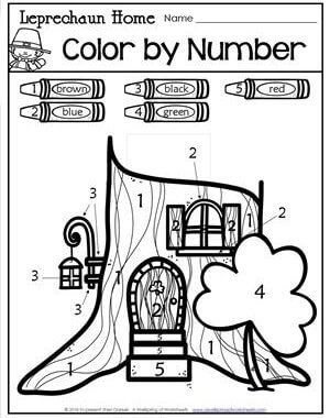 Here's a possibility of what a leprechaun home might look like. Kids look at the numbers on this house, check them against the color code, and color.